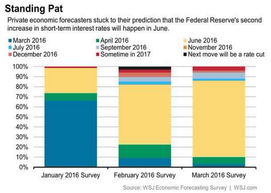 Ecco il grafico che mostra un sondaggio degli economisti sulle aspettative di rialzo dei tassi.